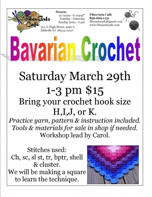 Bring your crochet hook size H, I, J, or K. Practice yarn, pattern & instruction included in the $15 Fee Tools and materials for sale in shop if needed. Workshop lead by Carol.
