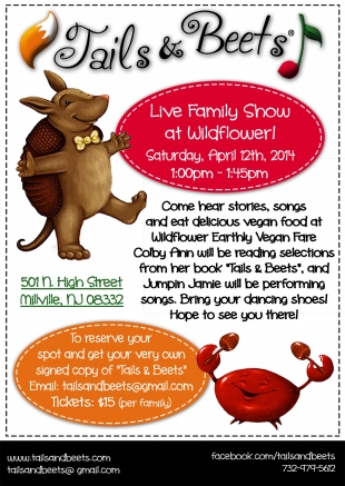 Come hear stories, songs and eat delicious vegan food at Wildflower Earthly Vegan Fare in Millville, NJ! Vegan author/illustrator Colby Ann will be reading selections from the book "Tails & Beets", and kindie rock musician Jumpin Jamie will be performing songs So get ready to use your imagination, and dont forget to bring your dancing shoes! We hope to see you there!