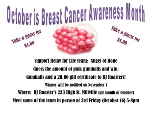 Take a guess at how many gumballs are in the jar and win them plus $20 gift certificate to BJ Roasters! Contest starts at the dine in or take out restaurant on October 1st.